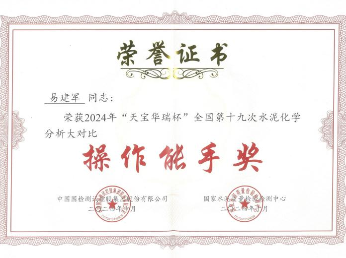 近日,由國家水泥質量檢驗檢測中心主辦的“天寶華瑞杯”全國第十九次水泥化學分析大對比總結表彰暨技術研討會在廣西南寧召開,湖南省建筑材料質量監(jiān)督檢驗授權站(以下簡稱“省建材質檢站”)斬獲特等獎,易建軍獲得化學分析“操作能手”榮譽稱號,再創(chuàng)佳績。