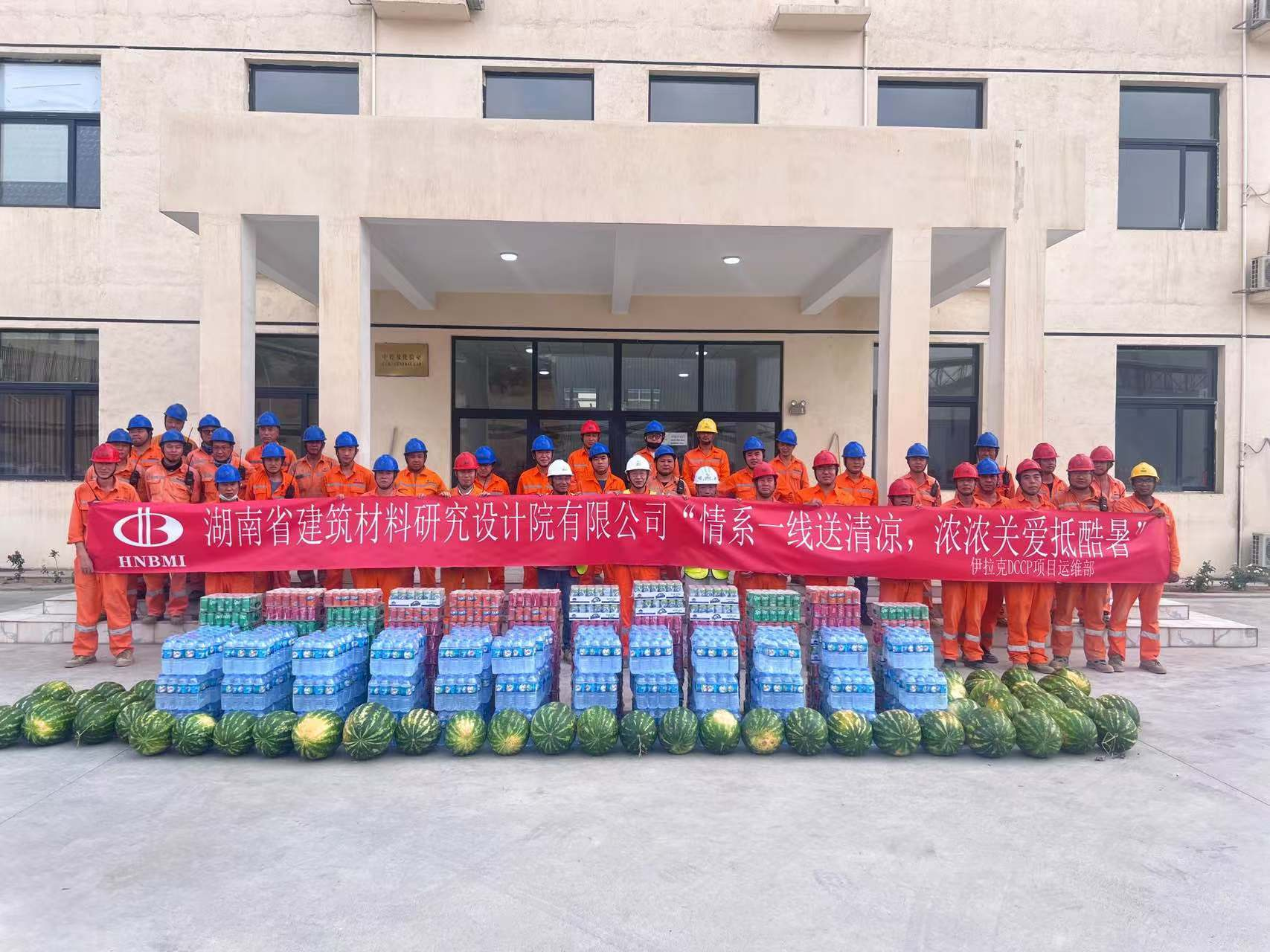 與此同時(shí),正值伊拉克埃爾比勒市夏日,水泥廠生產(chǎn)車間內(nèi)機(jī)器轟鳴,室外設(shè)備區(qū)地表溫度早已突破 48℃。運(yùn)維項(xiàng)目部員工頂著高溫在回轉(zhuǎn)窯、磨機(jī)、輸送帶等關(guān)鍵設(shè)備旁巡檢、調(diào)試,保障生產(chǎn)線穩(wěn)定運(yùn)轉(zhuǎn)。為給高溫下堅(jiān)守的員工送去關(guān)懷,項(xiàng)目部組織了“夏季送清涼”活動?;顒赢?dāng)天,項(xiàng)目部管理人員帶著包含礦泉水、飲料、西瓜、綠豆湯、藿香正氣水等防暑降溫物品的 “清涼物資” 來到生產(chǎn)現(xiàn)場。在發(fā)放現(xiàn)場,項(xiàng)目負(fù)責(zé)人周仕平詳細(xì)詢問大家的工作狀態(tài)和身體情況,反復(fù)叮囑高溫作業(yè)時(shí)注意勞逸結(jié)合,嚴(yán)格遵守夏季施工防暑規(guī)定,做好自身防護(hù)。